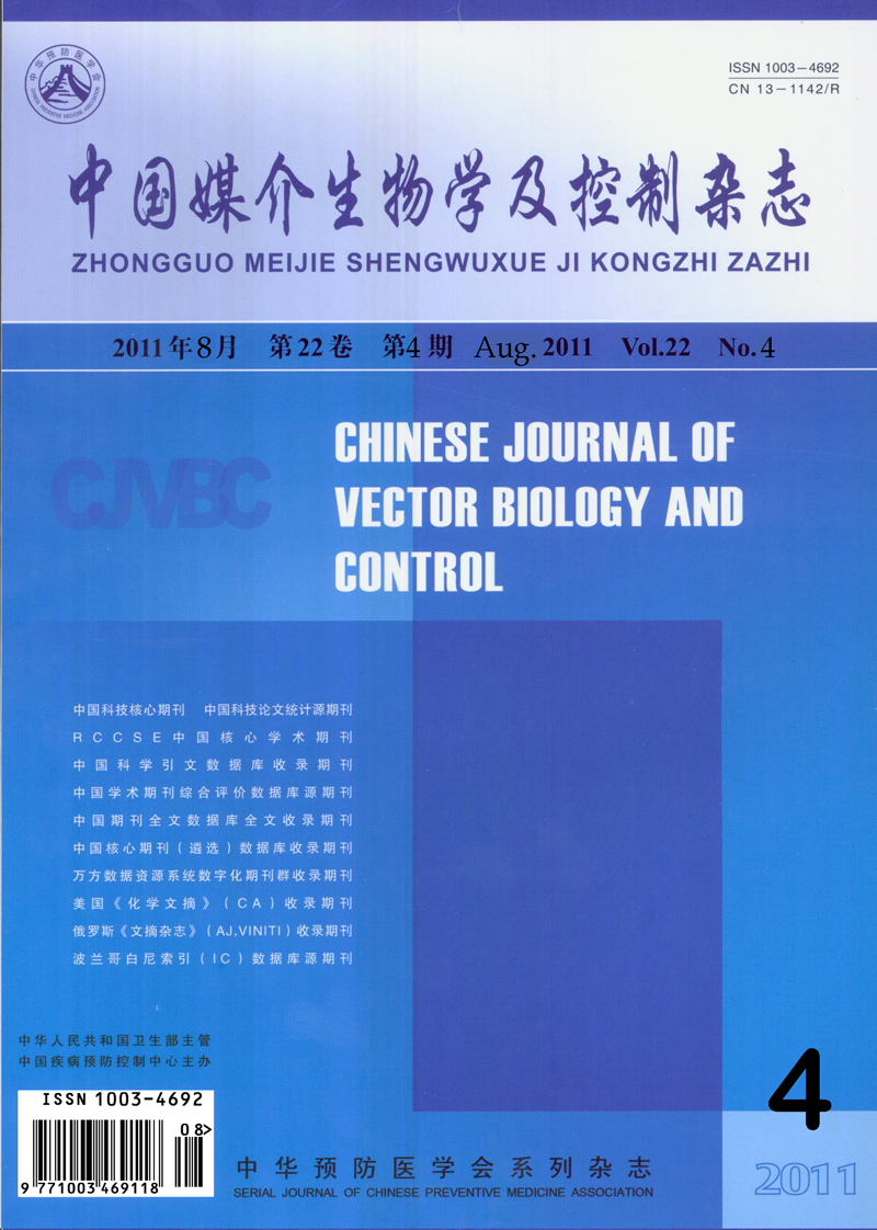 目的 比较黑箱法和二氧化碳(CO2)诱捕法监测蚊虫密度的差异,探讨黑箱法在蚊虫密度监测中的作用。方法 在2个区7个点比较黑箱法和CO2诱捕法监测蚊虫密度、种类的差异,比较2种方法 监测蚊种构成比、性别比和季节消长趋势的相关性。结果 黑箱法监测蚊虫平均密度为25.63只/箱,是CO2诱捕法平均密度(7.32只/器)的3.50倍,黑箱法监测雌蚊平均密度为14.65只/箱,是CO2诱捕法平均密度(6.23只/器)的2.35倍,2种方法差异有统计学意义,密度指数无相关性;黑箱法捕获蚊种构成,淡色库蚊占捕蚊总数的94.97%,为优势蚊种;白纹伊蚊占4.97%,三带喙库蚊和中华按蚊各仅占0.03%;CO2诱捕法捕获蚊种构成,淡色库蚊占捕蚊总数的79.26%,为优势蚊种;白纹伊蚊占18.27%,三带喙库蚊和中华按蚊分别占2.10%和0.37%,2种监测方法蚊虫构成比差异有统计学意义。结论 黑箱法设备简单,易操作,经济成本低,适用范围较广,比较适合淡色库蚊的监测,在淡色库蚊为优势种的地区,可使用黑箱法进行蚊虫密度监测;CO2诱捕法除适合淡色库蚊监测外,还适用于白纹伊蚊监测。