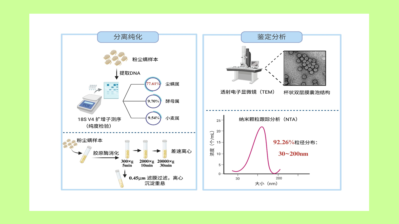 目的: 针对从复杂整体粉尘螨中分离与鉴定外泌体的技术难题,建立稳定可靠的粉尘螨外泌体分离纯化与鉴定方法。方法: 取粉尘螨,用18S rRNA基因V4可变区为DNA条形码进行纯度检验,差速离心法分离外泌体,通过透射电子显微镜(TEM)表征外泌体结构,纳米颗粒跟踪分析(NTA)测定粒径分布与颗粒浓度。结果: 扩增子测序显示,样本中尘螨属序列占77.61%,酵母菌属占9.70%,小麦属占9.54%,簇虫属占1.62%,黑麦属占0.51%,大麦属占0.09%。TEM视野下观察到清晰的茶托状或杯状双层膜囊状外泌体样结构。NTA分析外泌体测得其平均粒径为(122.9±3.4)nm,92.26%的颗粒粒径分布在30~200 nm。结论: 建立了一种新的粉尘螨外泌体分离纯化方法。