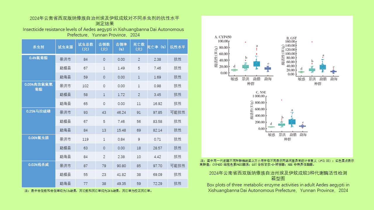 目的: 了解云南省登革热防控重点地区西双版纳傣族自治州(西双版纳州)埃及伊蚊对常用杀虫剂的抗性水平,并从酶学水平初步探索其代谢抗性机制,为该地区埃及伊蚊防控及抗药性治理提供科学依据。方法: 2024年8月分别在西双版纳州景洪市、勐腊县和勐海县采集埃及伊蚊幼虫,经饲养繁殖至子一代成蚊,采用成蚊接触筒法检测成蚊对氯菊酯、高效氯氟氰菊酯、马拉硫磷、氟虫腈、残杀威的抗性。采用皮尔逊χ2检验或Fisher确切概率法比较不同地区蚊虫击倒率及24 h死亡率差异。采用酶联免疫吸附试验检测雌蚊细胞色素P450酶系(CYP450)、谷胱甘肽-S-转移酶(GST)和非特异性酯酶(NSE)的活性,组间差异比较采用Wilcoxon秩和检验或Kruskal-Wallis H秩和检验,酶活性箱型图由Origin 2024软件绘制。结果: 西双版纳州埃及伊蚊接触氯菊酯24 h死亡率为1.69%~7.46%,高效氯氟氰菊酯为0.98%~16.92%,马拉硫磷为82.14%~97.85%,氟虫腈为0.71%~28.57%,残杀威为69.09%~97.70%。景洪市、勐腊县和勐海县3地埃及伊蚊种群接触4种杀虫剂死亡率差异均有统计学意义(高效氯氟氰菊酯:P < 0.001;马拉硫磷:χ2=12.939,P=0.002;氟虫腈:χ2=15.594,P < 0.001;残杀威:χ2=23.198,P < 0.001)。景洪市埃及伊蚊CYP450、GST和各类NSE活性分别为敏感品系的1.96、1.74和2.00倍。结论: 西双版纳州埃及伊蚊对多种类型杀虫剂已产生不同程度抗性,且抗性存在区域差异,部分地区抗性水平较高。西双版纳州埃及伊蚊抗药性形成与代谢酶升高可能有关。建议西双版纳州进一步加强抗药性监测与机制研究,依据区域抗药性图谱制定精准杀虫剂轮替策略,并结合综合防制原则科学选用杀虫剂,以延缓抗药性发展。