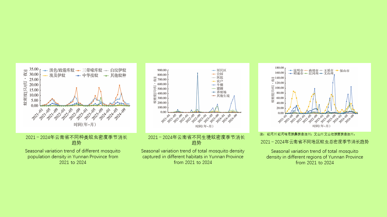 目的: 掌握云南省蚊虫种类构成、密度动态及季节消长规律,为蚊媒传染病风险评估和精准防控提供科学依据。方法: 按照《全国病媒生物监测实施方案》,采用诱蚊灯法于2021-2024年在云南省开展成蚊月度监测,通过形态学方法鉴定蚊种,利用Kruskal-Wallis H检验比较蚊密度、χ2检验分析蚊种群构成差异,采用Joinpoint对数线性回归模型分析蚊密度动态变化趋势,选择Pearson相关分析评估成蚊密度与气象数据的关联性。结果: 2021-2024年云南省平均蚊密度为8.56只/(灯·夜),2021-2024年总蚊密度呈上升趋势,年度变化百分比(APC)=30.05(95%CI:8.14~56.94,Z=5.271,P=0.034),三带喙库蚊与淡色/致倦库蚊构成比较高,分别为47.56%(65 357/137 420)和36.16%(49 692/137 420),中华按蚊和白纹伊蚊次之,分别为9.89%(13 592/137 420)和1.16%(1 596/137 420)。蚊密度高峰期集中于6-9月,呈单峰(2021-2022年)或双峰型(2023-2024年)。养殖场、牛棚、猪圈、农户、居民区、公园和医院的蚊密度分别为149.08、21.92、18.77、7.87、6.45、4.09和3.84只/(灯·夜),不同生境间蚊种构成差异有统计学意义(χ²=24 211.241,P < 0.001);牲畜场所(牛棚、猪圈、养殖场)以三带喙库蚊为主要蚊种。不同地区蚊种构成差异有统计学意义(χ²=45 287.397,P < 0.001);保山市和昭通市蚊密度较高,为26.31和25.16只/(灯·夜),红河哈尼族彝族自治州最低,为1.72只/(灯·夜)。云南省总蚊密度与平均气压和平均风速呈显著负相关(r=-0.719,P < 0.001;r=-0.354,P=0.014),与平均气温、相对湿度和月降水量呈显著正相关(r=0.749,P < 0.001;r=0.491,P < 0.001;r=0.795,P < 0.001)。结论: 云南省2021-2024年蚊密度呈明显上升趋势,牲畜养殖环境是蚊虫高发区域,6-9月为防控关键期,需针对滇西(保山市)、滇东北(昭通市)及养殖场/牛棚/猪圈等蚊虫高发区域强化干预。