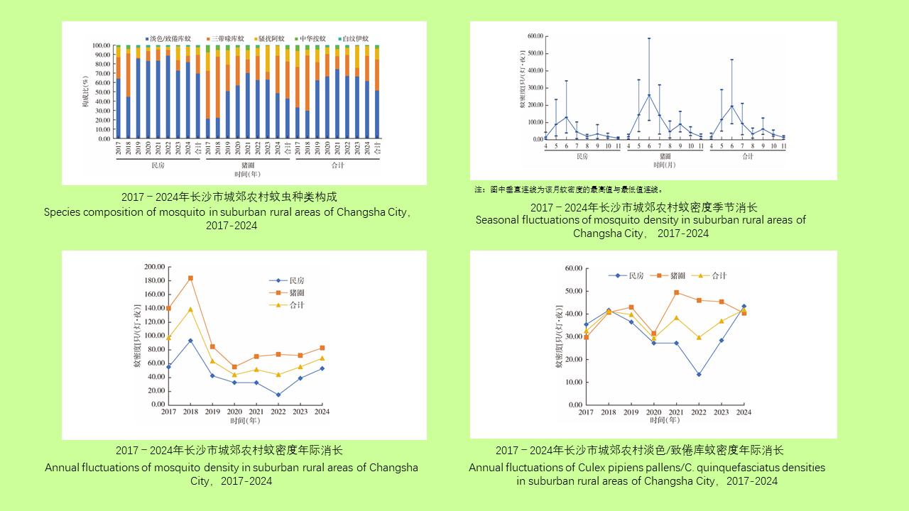 目的: 分析2017-2024年长沙市城郊农村蚊虫消长规律,为长沙市城郊农村蚊虫的综合防制提供科学依据。方法: 每年4-11月,使用诱蚊灯法在长沙市城郊农村的民房、猪圈开展蚊虫监测,对其种类构成、密度年际消长及季节消长进行分析。采取χ2检验对蚊虫种类构成比进行比较,采取Wilcoxon秩和检验对不同生境的蚊密度进行比较,采取Kruskal-Wallis H检验对不同年份及不同月份的蚊密度进行比较。结果: 2017-2024年长沙市城郊农村优势蚊种为淡色/致倦库蚊、三带喙库蚊及骚扰阿蚊,构成比分别为51.38%、33.26%、11.50%,不同年份蚊虫构成比差异有统计学意义(χ2=14 080.873,P < 0.001)。2017-2024年平均蚊密度为70.47只/(灯·夜),2017-2018年密度升高,2018-2020年迅速下降,2020-2024年缓慢上升,2018年蚊密度最高,为138.61只/(灯·夜),2020年最低,为44.13只/(灯·夜),不同年份间蚊密度差异无统计学意义(H=6.098,P=0.528)。猪圈平均蚊密度[95.44只/(灯·夜)]高于民房[45.50只/(灯·夜)](Z=-3.948,P < 0.001)。全年蚊虫季节消长呈双峰分布,6月及9月为密度高峰。不同月份间蚊密度差异有统计学意义(H=73.928,P < 0.001),蚊虫活动高峰主要集中在每年的5-7月及9月,密度分别为117.22、195.08、93.95和62.18只/(灯·夜)。结论: 2017-2024年长沙市城郊农村蚊密度呈先升高、后迅速下降、再缓慢上升的趋势,蚊虫活动高峰主要集中在每年的5-7月及9月。应结合城郊农村的生态环境特点及蚊虫活动高峰,制定相应的蚊虫综合防制方案。