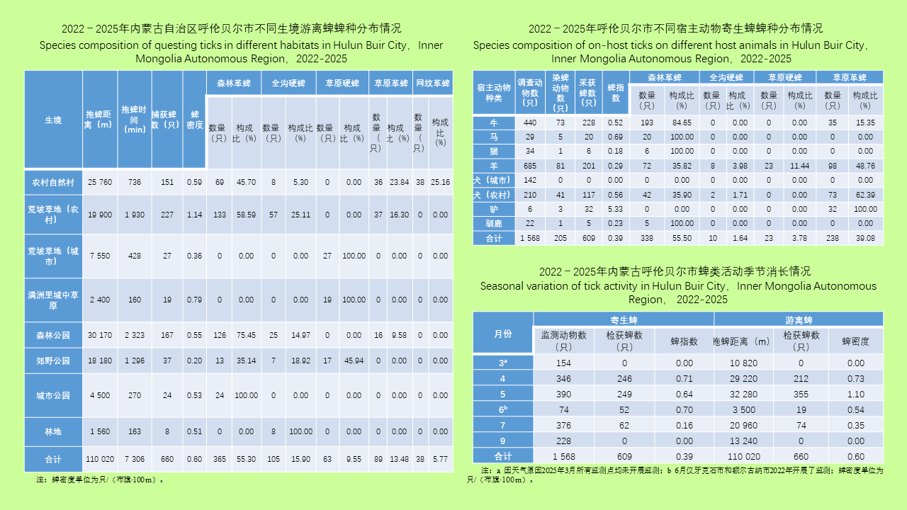 目的: 掌握呼伦贝尔市部分地区蜱的种类构成、密度和季节消长规律。方法: 2022-2025年每年3-9月在呼伦贝尔市选择农村外环境、景区、公园、荒坡草地,采用布旗法监测游离蜱、体表检蜱法监测寄生蜱。使用Excel 2010和SPSS 22.0软件进行数据处理和分析,计数资料组间比较采用χ2检验或Fisher确切概率法,计量资料采用Kruskal-Wallis H秩和检验。结果: 寄生蜱指数为0.39,游离蜱密度为0.60只/(布旗·100 m),捕获蜱中森林革蜱数量最多,构成比为55.40%。不同宿主动物间寄生蜱种类构成(χ2=560.539,P < 0.001)和不同生境间游离蜱种类构成(χ2=1 386.520,P < 0.001)差异均有统计学意义。不同宿主动物间寄生蜱指数(H=15.878,P=0.044)及不同生境间游离蜱密度(H=14.654,P=0.041)差异有统计学意义;驴的蜱指数最高(5.33),其次是马(0.69);农村荒坡草地游离蜱密度最高,为1.14只/(布旗·100 m),郊野公园最低,为0.20只/(布旗·100 m);地区间寄生蜱指数差异无统计学意义(H=5.270,P=0.261),游离蜱密度差异有统计学意义(H=11.007,P=0.026),牙克石市最高,为1.18只/(布旗·100 m),满洲里市最低,为0.22只/(布旗·100 m);不同月份游离蜱密度与寄生蜱指数差异均有统计学意义(H=31.625,P < 0.001;H=20.646,P=0.001),4-5月为蜱高发期,6-7月活动减弱,3月和9月未捡获。结论: 森林革蜱为呼伦贝尔地区优势蜱种,不同宿主动物体表寄生蜱种构成不同,荒坡草地为蜱最高发环境,4-5月是呼伦贝尔地区蜱高发季节。