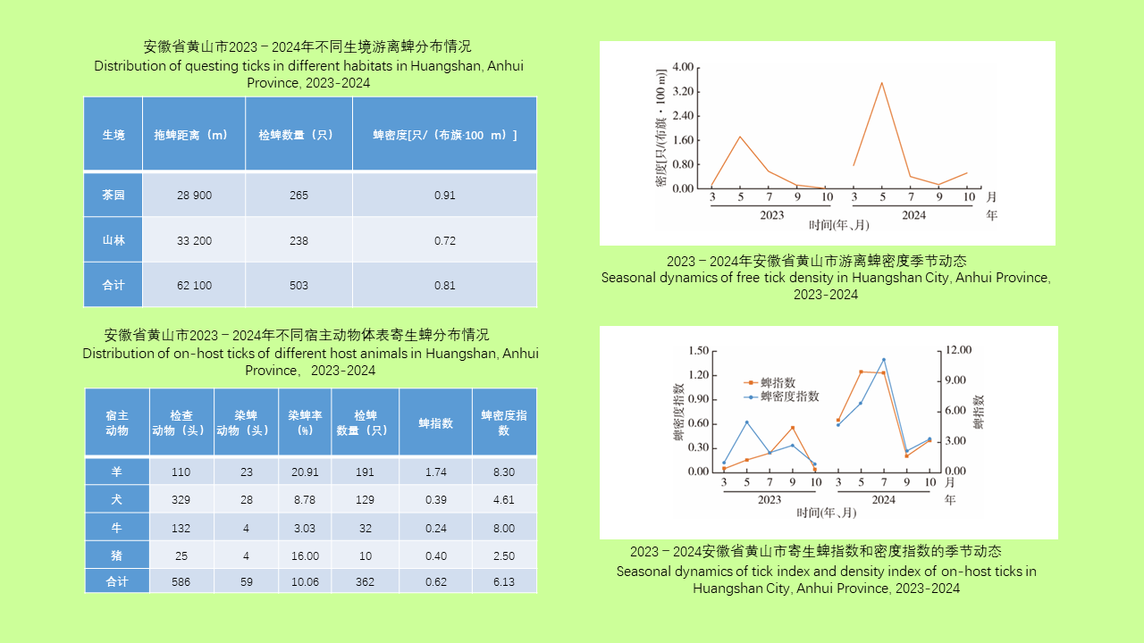 目的: 了解安徽省黄山市蜱种类、季节动态规律及其分布状况,为黄山市蜱防治工作以及蜱媒传染病防控研究提供科学依据。方法: 2023-2024年在黄山市歙县和黟县的山林与茶园生境中,每3、5、7、9、10月开展1次游离蜱(人工布旗法)和寄生蜱(体表检蜱法)监测。将所有检获蜱(寄生蜱与游离蜱)按样本采集的宿主/生境分装于离心管,并编号。记录采集时间、地点、宿主体/生境类型、寄生部位及数量等信息。蜱种鉴定经黄山市疾病预防控制中心初步形态学鉴定及中国科学院动物研究所形态学复核鉴定。使用WPS 12.1.0.22529软件整理数据,SPSS 20.0软件进行统计学分析。不同生境类型间游离蜱密度的比较采用Kruskal-Wallis H检验,蜱种间构成比较采用χ2检验。结果: 共捕获蜱1科4属10种,其中血蜱属5种(褐黄血蜱、长角血蜱、豪猪血蜱、钝刺血蜱、铃头血蜱),扇头蜱属3种(血红扇头蜱、微小扇头蜱、镰形扇头蜱),硬蜱属1种(中华硬蜱),花蜱属1种(龟形花蜱),不同蜱种构成比差异有统计学意义(χ2=227.289,P < 0.001)。2023-2024年监测期间,人工布旗法共拖蜱62 100 m,采集蜱503只,总密度为0.81只/(布旗·100 m)。茶园蜱密度0.91只/(布旗·100 m),高于山林的0.72只/(布旗·100 m),不同生境类型游离蜱密度差异有统计学意义(H=10.575,P < 0.001)。共检查宿主动物586只,其中59只染蜱,检获寄生蜱263只。羊的染蜱率最高(20.91%),牛最低(3.03%),不同宿主动物染蜱率差异有统计学意义(χ2=23.057,P < 0.001)。蜱类季节活动呈单峰模式,游离蜱密度3月较低,5月达高峰,寄生蜱密度指数在7月达峰值。结论: 黄山市山林与茶园生境中均有蜱活动,蜱种丰富多样。羊群活动生境和茶园是蜱防控的重点区域。蜱活动季节性明显,建议在蜱高发季节,采取多种形式对茶农和外出旅游人群进行蜱防护相关知识的健康教育。