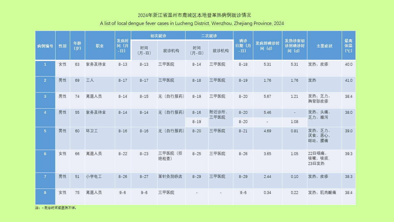 目的: 分析城市特殊环境登革热暴发疫情应急处置工作,评估综合防控措施在复杂环境中的实际应用价值,为应对气候变化背景下同类型地区登革热防控策略优化提供实践参考。方法: 以2024年8-10月浙江省温州市鹿城区暴发的本地登革热疫情流行特征为参考,应用大数据轨迹碰撞技术精准定位暴露风险点;融合布雷图指数法、双层叠帐法和BG-trap捕蚊器法构建媒介伊蚊动态监测网络;应用无人机超低容量喷雾技术,克服复杂地形消杀瓶颈;开展空间管理及社区联动孳生地清理,多维度实施媒介控制。采用Mann-Whitney U检验评估控制效果。结果: 本次疫情历时19 d,累计确诊8例病例,空间聚集明显。发病时间集中在8月13-17日,男女性别比1:0.60,均为中老年人(年龄中位数为64.50岁)。病例确诊时间从2.03 d降至0.46 d,核心区布雷图指数从平均9.06下降至2.86(U=551.500,P=0.006),成蚊密度从平均4.67只/(顶·h)下降至1.44只/(顶·h)(U=41.000,P=0.047)。结论: 城市山地公园在登革热传播中具有特殊风险,“精准溯源+空间管控+立体消杀+社区联动”的综合防控模式能显著提升复杂环境下的登革热疫情处置效能。