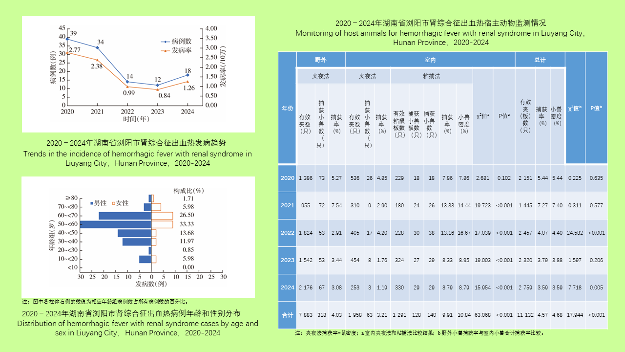 目的: 掌握湖南省浏阳市肾综合征出血热(HFRS)病例的流行特征,了解HFRS宿主动物分布与带病毒情况,为浏阳市HFRS疫情防制工作提供参考依据。方法: 采用描述流行病学方法分析2020-2024年浏阳市HFRS病例流行病学特征以及宿主动物监测数据。宿主动物监测野外采用夹夜法,室内同时采用夹夜法和粘捕法。SPSS 27.0软件用于统计分析,率的比较采用χ2检验,采用Joinpoint 5.4.0计算发病数的平均年度变化百分比(AAPC)。结果: 2020-2024年浏阳市共报告HFRS病例117例,年均报告发病率为1.65/10万,AAPC=-22.80%(P=0.190)。患者以男性中老年农民为主,病例相对集中于浏阳市北部乡镇(北乡),病例数占总病例数的68.38%(80/117),年均发病率为3.66/10万,东、西、南、北、城区5个区域间发病率差异有统计学意义(χ2=81.015,P < 0.001)。2020-2024年共捕获小型兽类(小兽)521只,总密度为4.68%(521/11 132),室内小兽密度(203/3 249,6.25%)高于野外(318/7 883,4.03%),室内监测粘鼠板法捕获率(128/1 291,9.91%)高于夹夜法(63/1 958,3.21%)(χ2=63.068,P < 0.001),上半年小兽密度(286/5 077,5.63%)高于下半年小兽密度(235/6 055,3.88%)(χ2=19.004,P < 0.001)。野外小兽以黑线姬鼠(266/318,83.65%)为主,室内以黄胸鼠(116/203,57.14%)、褐家鼠(39/203,19.21%)为主。送检小兽肺标本460份,检出汉坦病毒核酸阳性26份,其中汉滩病毒24份、汉城病毒2份,带病毒率为5.65%(26/460),野外小兽汉坦病毒带病毒率(23/271,8.49%)高于室内(3/189,1.59%)(χ2=10.571,P < 0.001)。结论: 2020-2024年来浏阳市HFRS疫情呈现下降趋势,汉滩病毒和汉城病毒均有分布,以汉滩病毒为主。应根据历年监测的HFRS流行情况,在重点地区浏阳市北部乡镇加强灭鼠工作,同时加强对该地区农民等重点人群或高风险人群的健康教育工作,提高民众防病和及时就医意识。