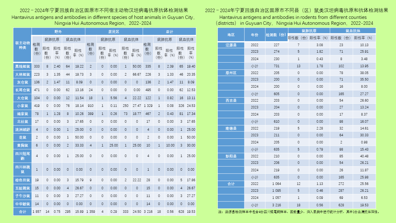 目的: 掌握2022-2024年宁夏回族自治区(宁夏)固原市肾综合征出血热(HFRS)宿主动物分布特征及其携带汉坦病毒抗原、抗体情况,为该地区预防HFRS人间疫情发生提供宿主动物监测预警依据。方法: 2022-2024年在固原市泾源县、原州区、西吉县、隆德县和彭阳县,按照《全国肾综合征出血热监测方案》每年开展春、秋两季野外和居民区宿主动物监测,采用5 m夹夜法监测鼠密度及其种群构成,同时采集其肺、血标本进行汉坦病毒抗原和抗体检测。运用SPSS 23.0软件进行统计分析,计数资料以率表示,采用χ2检验或Fisher确切概率法分析组间差异。结果: 2022-2024年宁夏固原市共捕获鼠3 216只(包括4只鼩鼱,因数量少,本文归入鼠类进行统计分析),平均鼠密度1.58%,野外鼠密度(1 857/100 613,1.85%)高于居民区(1 359/103 493,1.31%),且差异有统计学意义(χ2=93.298,P < 0.001)。野外(560/17 280,3.24%)和居民区(171/7 898,2.17%)鼠密度均以泾源县为最高,其他地区野外鼠密度均 < 2.50%,室内鼠密度均≤1.80%。各地区野外第1优势鼠种及构成比分别为:西吉县长尾仓鼠(423/506,83.60%)、彭阳县小家鼠(215/259,83.01%)、隆德县小家鼠(193/330,58.48%)、泾源县黑线姬鼠(227/560,40.53%)、原州区黑线姬鼠(73/202,36.14%);居民区第1优势鼠种除原州区为褐家鼠(241/403,59.80%)外,其余均为小家鼠,构成比除泾源县外均 > 70.00%。鼠血清抗体3年平均阳性率为19.53%(628/3 216),鼠肺抗原平均阳性率为0.56%(18/3 216),二者差异有统计学意义(χ2=64.317,P < 0.001);其中仅在泾源县和隆德县发现鼠肺抗原阳性,其阳性率分别为1.78%(13/731)和0.79%(5/635),经Fisher确切概率法检验,2县鼠肺抗原阳性率差异无统计学意义(P=0.109);鼠血清抗体阳性率中原州区最高(165/605,27.27%)、泾源县最低(102/731,13.95%),不同县(区)血清抗体阳性率差异有统计学意义(χ2=65.822,P < 0.001);野外鼠肺抗原阳性率为0.75%(14/1 857),鼠血清抗体阳性率为15.89%(295/1 857),差异有统计学意义(χ2=278.727,P < 0.001);居民区鼠肺抗原阳性率为0.29%(4/1 359),鼠血清抗体阳性率为24.50%(333/1 359),差异有统计学意义(χ2=366.650,P < 0.001)。鼠肺抗原阳性主要集中在黑线姬鼠和大林姬鼠,二者合计占比为61.11%(11/18),鼠血抗体阳性主要集中在小家鼠和褐家鼠,二者合计占比为64.81%(407/628)。汉坦病毒基因分型显示捕获鼠类携带的汉坦病毒均为汉滩型。结论: 2022-2024年宁夏固原市HFRS宿主动物整体分布特征与既往监测结果差异不大,宿主动物抗原阳性主要在泾源县姬鼠中检出,提示该地区HFRS流行风险相对较高,应强化监测预警,警惕人间HFRS疫情暴发流行。