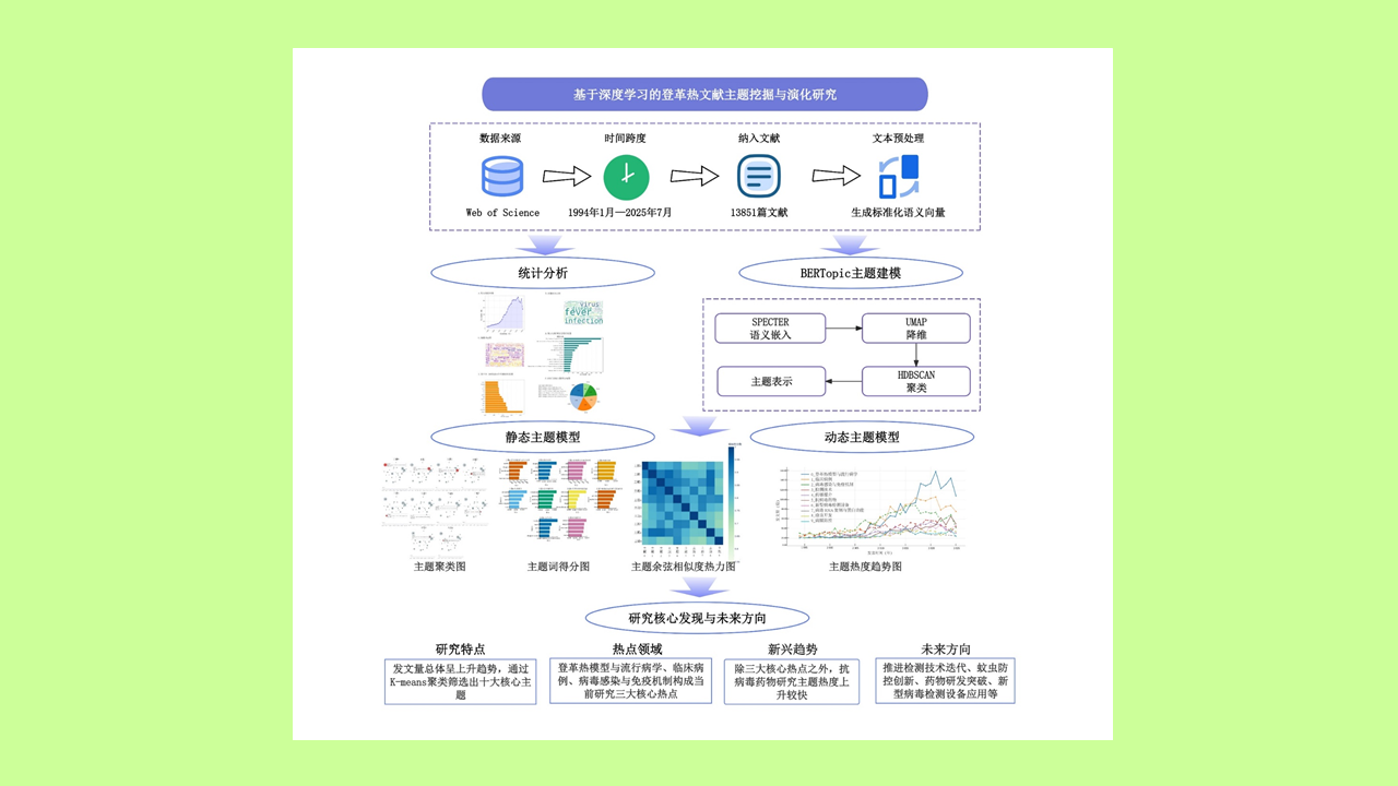 目的: 探讨登革热领域主题的热点分布和演化规律,明确该疾病的研究重点与发展趋势。方法: 在Web of Science核心合集中检索1994年1月至2025年7月登革热相关英文文献,绘制文献特征统计图;基于深度学习方法进行主题建模,分析主题特征、关联及演化趋势。结果: 共纳入文献13 851篇,发文量总体呈上升趋势,2005年后增幅显著,2021年达峰值后略有回落但维持较高水平。关键词与摘要高频词分析显示,dengue、virus、fever、infection为核心高频术语;进一步通过词频-逆文档频率(TF-IDF)算法计算的前15个关键词中,dengue得分最高;PLOS Neglected Tropical Diseases期刊的登革热相关文献发表量居首位;聚类分析显示构成比前3位为聚类1(登革热防控策略研究,22.90%)、聚类0(登革病毒的基础医学研究,19.80%)、聚类2(登革病毒的蚊媒传播研究,18.20%)。BERTopic主题建模识别出116个研究主题,通过K-means聚类筛选出登革热模型与流行病学、临床病例、病毒感染与免疫机制、检测技术、传播媒介、抗病毒药物、新型病毒检测设备、病毒RNA复制与蛋白功能、疫苗开发和病媒防控10大核心主题。主题热度趋势图显示,登革热模型与流行病学、临床病例、病毒感染与免疫机制以及抗病毒药物研究主题热度上升较快。结论: 登革热研究热点主要集中在登革热模型与流行病学、临床病例、病毒感染与免疫机制研究等领域,未来深化上述核心热点领域的研究,推进检测技术迭代、蚊虫防控创新、药物研发突破、新型病毒检测设备应用等或将成为登革热领域的重要研究方向。