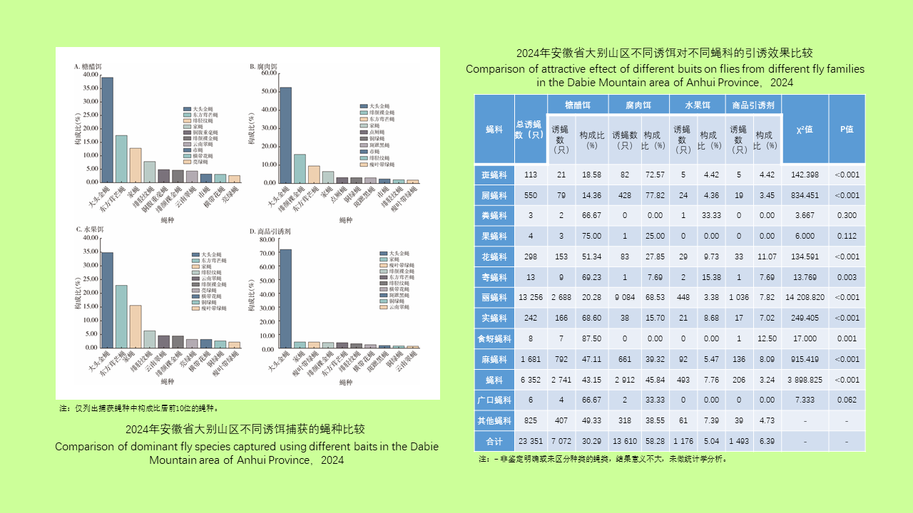 目的: 了解不同诱饵对蝇类的引诱效果,为蝇类生态学监测与防治提供科学依据。方法: 于2024年9-10月在安徽省大别山区分别采用糖醋饵、腐肉饵、水果饵及商品引诱剂作为诱饵,通过笼诱法对比其诱蝇效果。运用Excel 2021软件进行数据整理与汇总,R 4.4.0软件对不同诱饵诱蝇密度进行Kruskal-Wallis H检验和Mann-Whitney U检验,采用χ2检验分析不同诱饵对不同蝇科蝇类的引诱效果差异,并使用Origin 2022绘图。结果: 腐肉饵、糖醋饵、水果饵和引诱剂的诱蝇密度中位数分别为53.27、3.51、1.73、和1.28只/笼,不同诱饵诱蝇密度的中位数差异有统计学意义(H=34.176,P < 0.001),而糖醋饵、水果饵与引诱剂3者间的诱蝇密度中位数两两比较差异均无统计学意义(均P > 0.05)。糖醋饵诱集到的蝇类种数最多,为53种,腐肉饵次之,为44种,商品引诱剂和水果饵诱集效果相对较差,分别为36和35种。4种诱饵中大头金蝇的捕获量均最高,不同蝇种对不同类型诱饵的趋性不同,除果蝇科、粪蝇科、广口蝇科外,4种诱饵对不同蝇科的引诱效果差异均有统计学意义(均P < 0.05)。结论: 建议日常监测工作中腐肉饵与糖醋饵相互结合,提升诱集蝇类群落的代表性。特定种类可选择专用引诱剂和水果饵。
