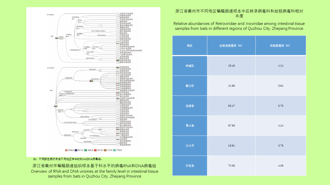 目的: 了解浙江省衢州地区栖息蝙蝠肠道组织携带病毒情况,为制定本地区公共卫生策略提供科学依据。方法: 2023年8-10月在衢州市6个采样点捕获167只蝙蝠,经鉴定94只为中华菊头蝠,73只为大蹄蝠,解剖并获取蝙蝠直肠(含粪便)样本。6个采样点均随机取24只蝙蝠肠道样本50 μg混合成1份样本,使用AllPrep Power Viral DNA/RNA试剂盒提取DNA和RNA,建立rRNA去除后的RNA转录组文库和DNA宏基因组文库。对提取的核酸样本进行Illumina测序,使用fastp 0.23.2获得高质量数据,利用软件Centrifuge 1.0.4、Bowtie2 2.5.1和SortMeRNA 4.3.6从高质量数据中获取携带病毒的核酸序列,metaSPAdes 3.15.5进行拼接组装后使用BLASTn 2.14.0和DIAMOND Blastx 2.1.8.162分别比对病毒核苷酸库和氨基酸库进行注释。采用R studio 4.3.3.3软件的Vegan包进行α多样性分析,采用主坐标分析(PCoA)进行β多样性分析,使用pheatmap包进行丰度分析。采用R studio 4.3.3.3软件进行Welch's t检验、Mann-Whitney U检验、Kruskal-Wallis H检验、Dunn's检验和置换多元方差分析,比较中华菊头蝠组与大蹄蝠组的病毒携带差异。结果: 对蝙蝠肠道组织样本进行Illumina测序分析,获得RNA病毒组13 522~187 260条序列,注释得到25个RNA病毒科。获得DNA病毒组105 553~177 241条序列,注释得到35个DNA病毒科。在RNA和DNA病毒种水平上,中华菊头蝠较大蹄蝠均具有较高的α多样性,但Welch's t检验显示差异无统计学意义(RNA病毒种水平Shannon值数:t=2.093,P=0.110;Simpson指数:t=2.121,P=0.129;DNA病毒种水平Shannon指数:t=1.356,P=0.247;Simpson指数:t=1.585,P=0.215);Bray-Curtis距离在RNA和DNA病毒组的组间差异均无统计学意义(RNA病毒组:F=2.305,R2=0.366,P=0.188;DNA病毒组:F=1.437,R2=0.264,P=0.175);反转录病毒科在中华菊头蝠组的丰度明显高于大蹄蝠组(U=2.004,P=0.002),丝核病毒科的丰度在不同样本间总体差异有统计学意义(H=10.301,P=0.035),龙游县蝙蝠样本中的丰度明显低于其他县(市、区)样本(均P < 0.05)。结论: 浙江省衢州市蝙蝠肠道病毒群落多样性丰富。中华菊头蝠和大蹄蝠在RNA与DNA病毒携带种类数无明显差异,其RNA病毒组群落结构呈现明显的按宿主物种聚类,而DNA病毒组则无此规律。