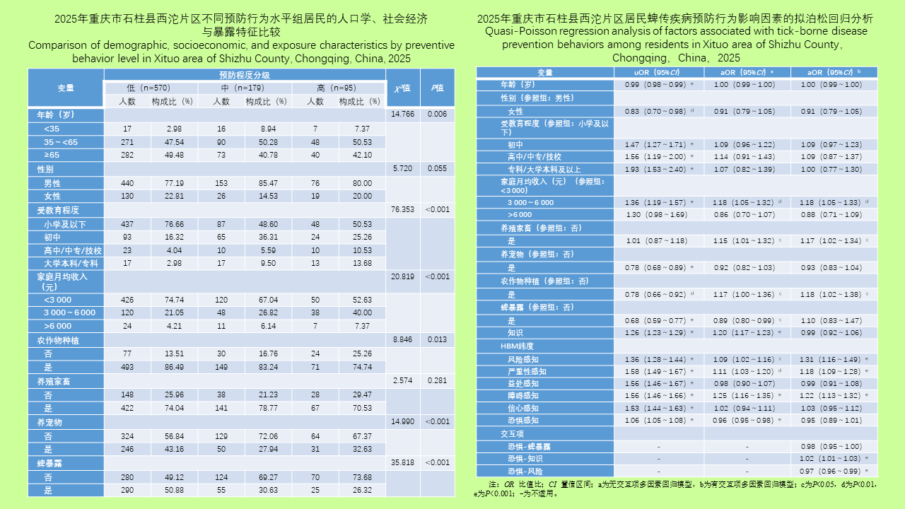 目的: 探究重庆市西南山区乡镇居民蜱传疾病预防行为的缺陷及其影响因素,为精准干预提供依据。方法: 采用横断面调查设计,于2025年3-4月对重庆市石柱土家族自治县西沱片区居民进行问卷调查,了解其蜱传疾病防护行为、相关知识以及信念感知情况。运用描述性分析、t检验、方差分析和拟泊松广义线性回归模型进行数据分析。重点探究健康信念模型核心维度及知识、人口学特征、社会经济因素等对蜱传疾病预防行为的影响。结果: 共纳入844份居民问卷进行分析。49.52%(418/844)的居民每次/经常进行高风险活动时穿长袖长裤,需要额外经济和时间投入的预防行为较为缺失,如仅25.71%(217/844)的居民每次/经常在接触有蜱叮咬动物后检查身体、洗澡、清洗衣物。92.06%(777/844)的居民掌握基础的蜱辨别能力,37.56%(527/844)的居民知晓蜱传播疾病,40.17%(339/844)知道移除蜱的正确方法,37.08%(313/844)知晓蜱传疾病能通过体液传播,37.08%(313/844)知晓蜱传疾病可能致命。障碍感知(aOR=1.25,95%CI:1.16~1.35)和风险感知(aOR=1.09,95%CI:1.02~1.16)在含有和未含有交互项的多因素回归模型中均表现出稳定的正向作用。恐惧感知与知识交互提升预防行为(aOR=1.02,95%CI:1.01~1.03),但与风险感知交互反而抑制预防行为(aOR=0.97,95%CI:0.96~0.99)。此外,37.68%(318/844)的居民对自身预防蜱传疾病的信心一般。家庭月均收入3 000~6 000元(aOR=1.18,95%CI:1.05~1.32)能提高预防行为,但受教育程度和更高的收入与预防行为的关联无统计学意义(均P > 0.05)。结论: 重庆市石柱县西沱片区居民蜱传疾病预防行为缺陷的核心困局在于知识缺陷以及恐惧感知的负向作用,干预措施应着重于提升自我效能、进行认知教育以及专门解决经济障碍和设施障碍。