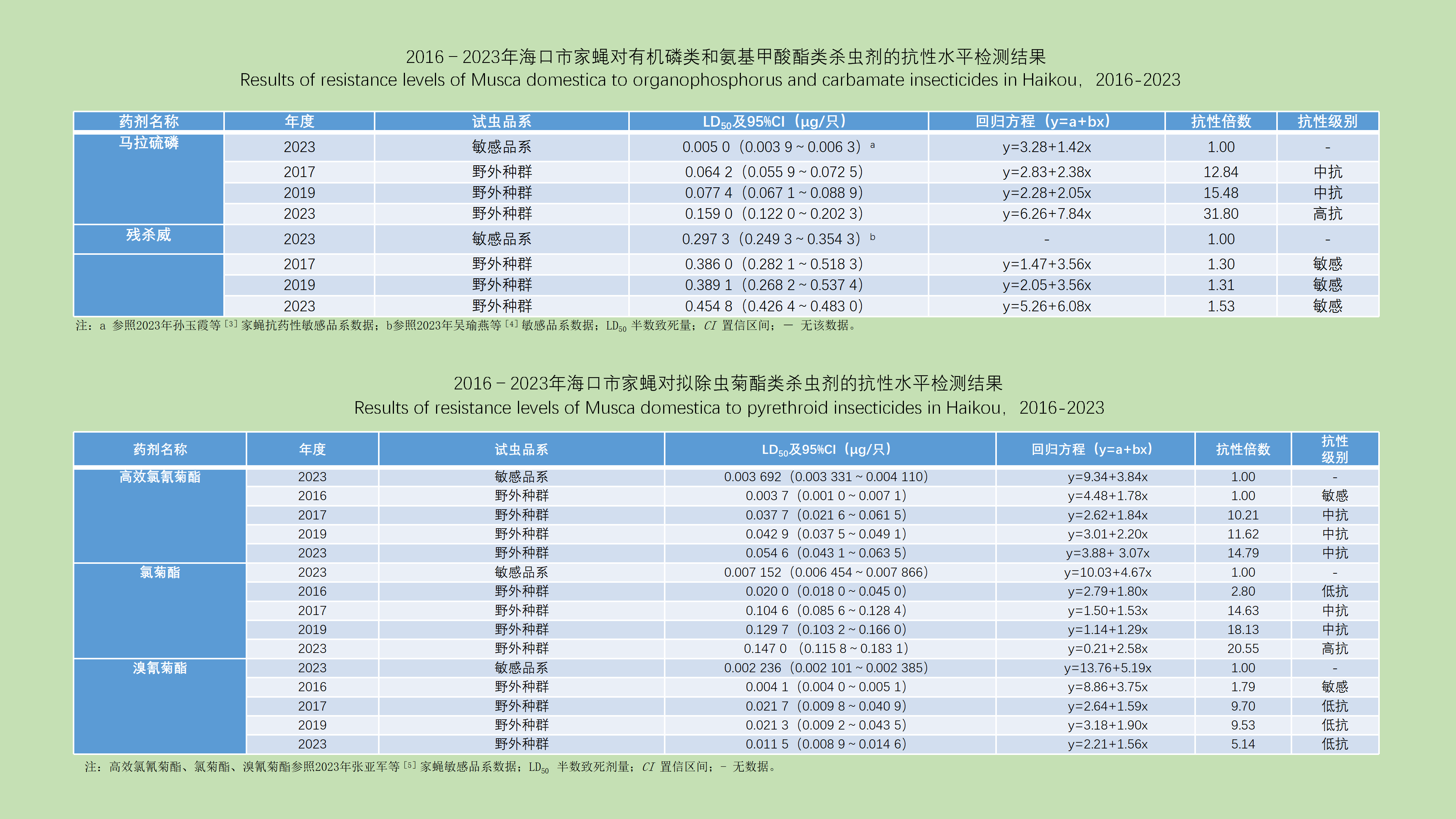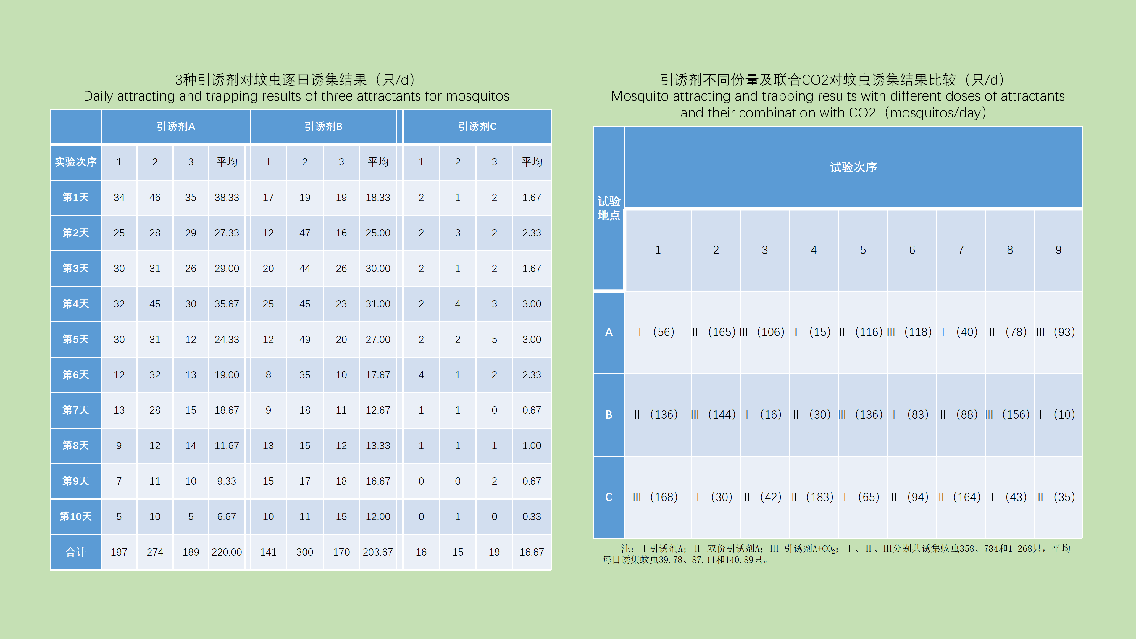 目的: 对虹口区近5年采用2种监测方法获得的白纹伊蚊幼蚊孳生情况进行比较,并分析2种监测方法的相关性,为优化白纹伊蚊及登革热监测、防控方案提供参考依据。方法: 2020—2024年每年5—10月采用布雷图指数(BI)法和诱蚊诱卵器法对虹口区8个街道的白纹伊蚊幼蚊进行密度监测,并进行监测结果比较和监测方法相关性分析。采用Excel 2021软件进行数据整理和汇总分析,SPSS 26.0用于统计学分析,方差分析比较不同年份和月份间的蚊密度差异,使用χ2检验比较不同生境间阳性容器构成和诱蚊诱卵指数(MOI)差异,使用Pearson相关分析研究2种监测方法的相关性。结果: 2020—2024年BI平均值分别为10.33、5.69、4.51、6.39和5.68,差异有统计学意义(F=3.384,P=0.004),其中2020年的BI高于其余4年(均P<0.05)。2020—2024年诱蚊诱卵指数平均值分别为6.95、6.58、8.08、11.81和9.32,差异有统计学意义(F=3.225,P=0.015),2020和2021年的MOI与2023年差异有统计学意义(均P<0.05)。不同时间MOI差异有统计学意义(F=2.487,P=0.019),其中7月上旬至9月上旬的监测结果高于5月下旬和6月上旬的结果(均P<0.05)。居民区BI季节消长呈波动曲线,公园的BI从6月逐渐上升,8月上旬达到最高。居民区和公园的MOI变化趋势相近,在7月下旬至8月下旬达到高峰,在高峰期公园的MOI高于居民区。居民区和公园的MOI差异有统计学意义(χ2=11.971,P=0.001)。Pearson相关分析发现,BI和MOI存在相关性(r=0.456,P=0.001)。结论: 虹口区夏季蚊密度高峰期出现在6月上旬至9月上旬,布雷图指数法和诱蚊诱卵器法2种不同的蚊密度监测方法存在相关性。