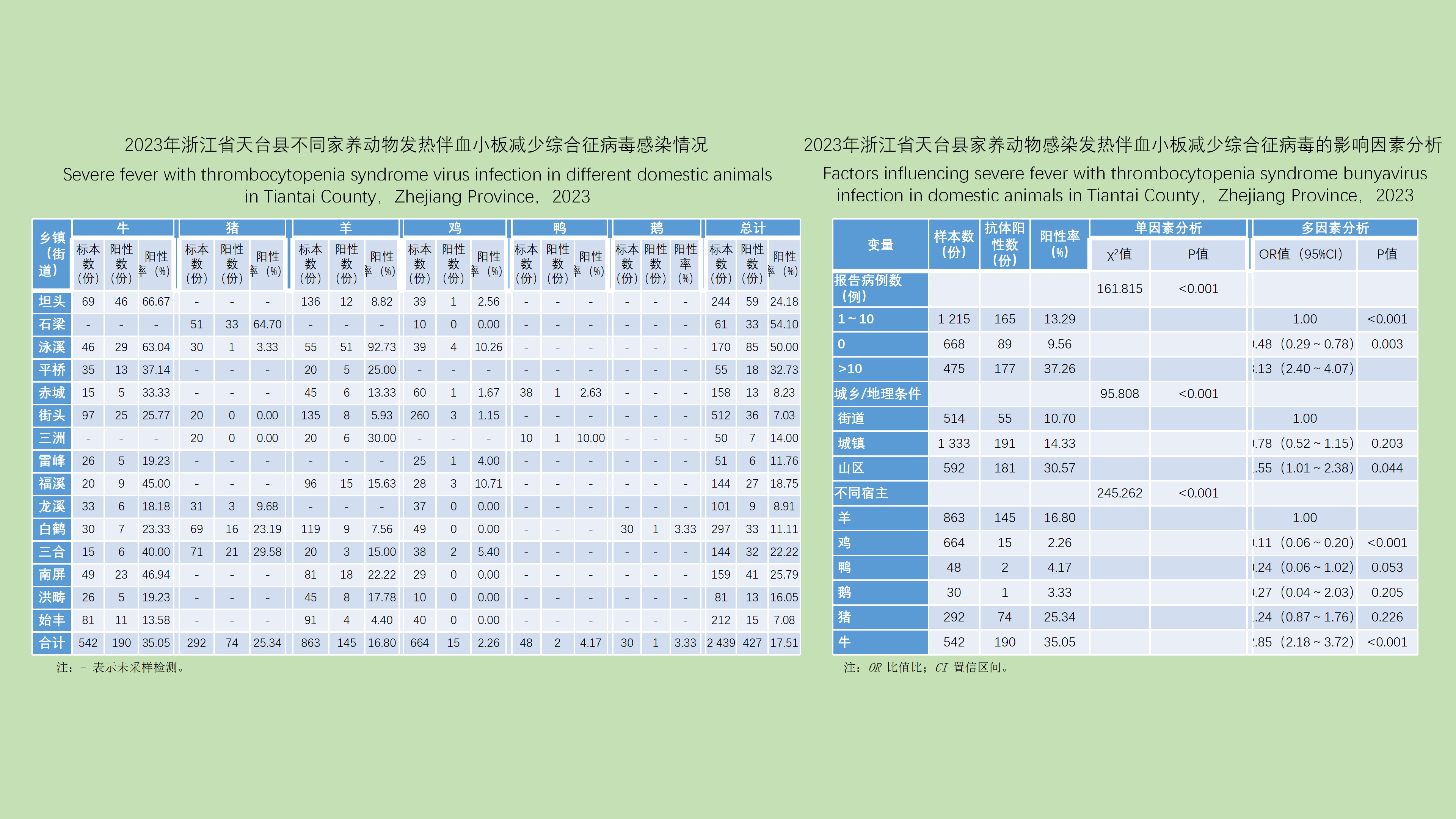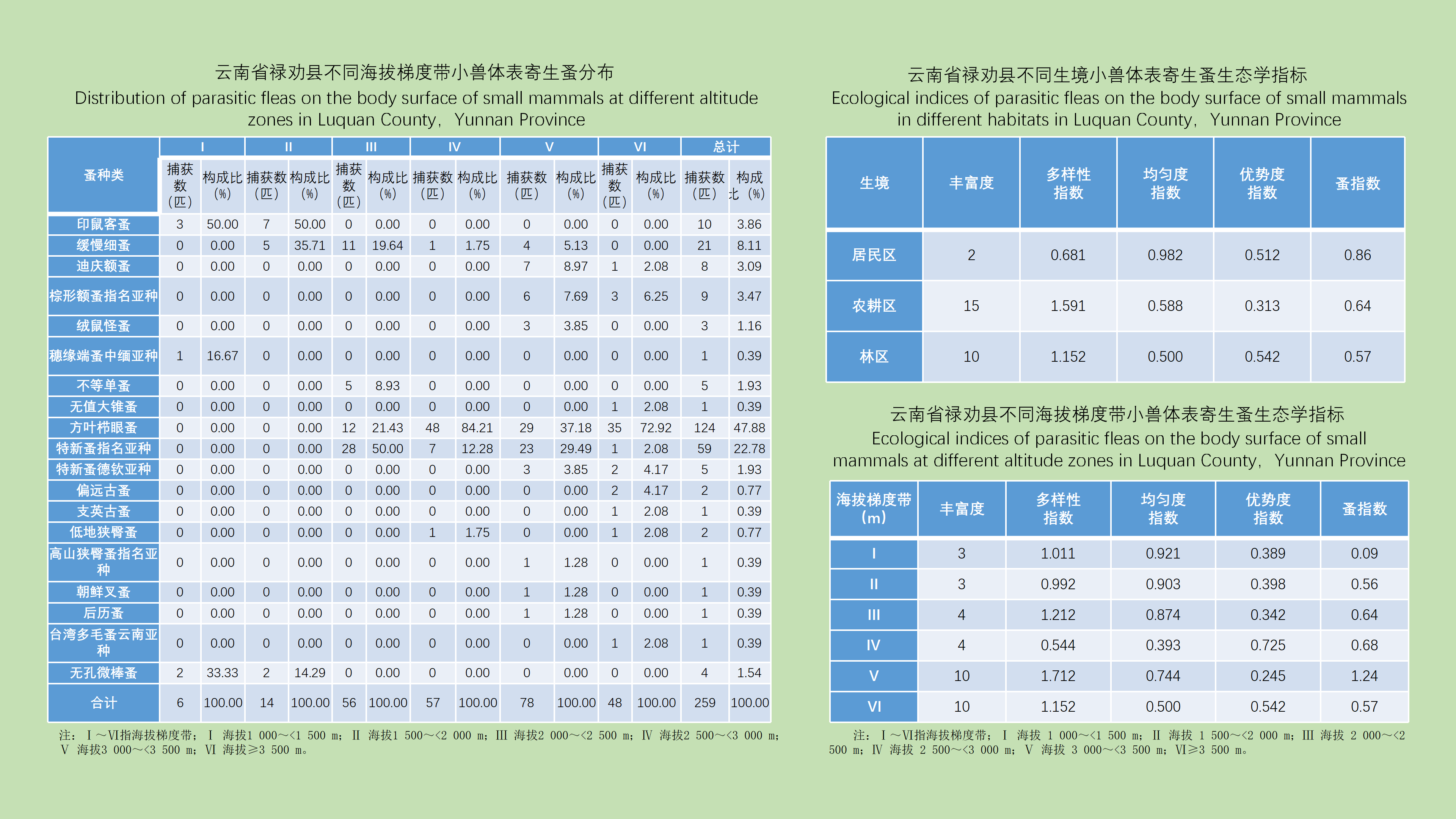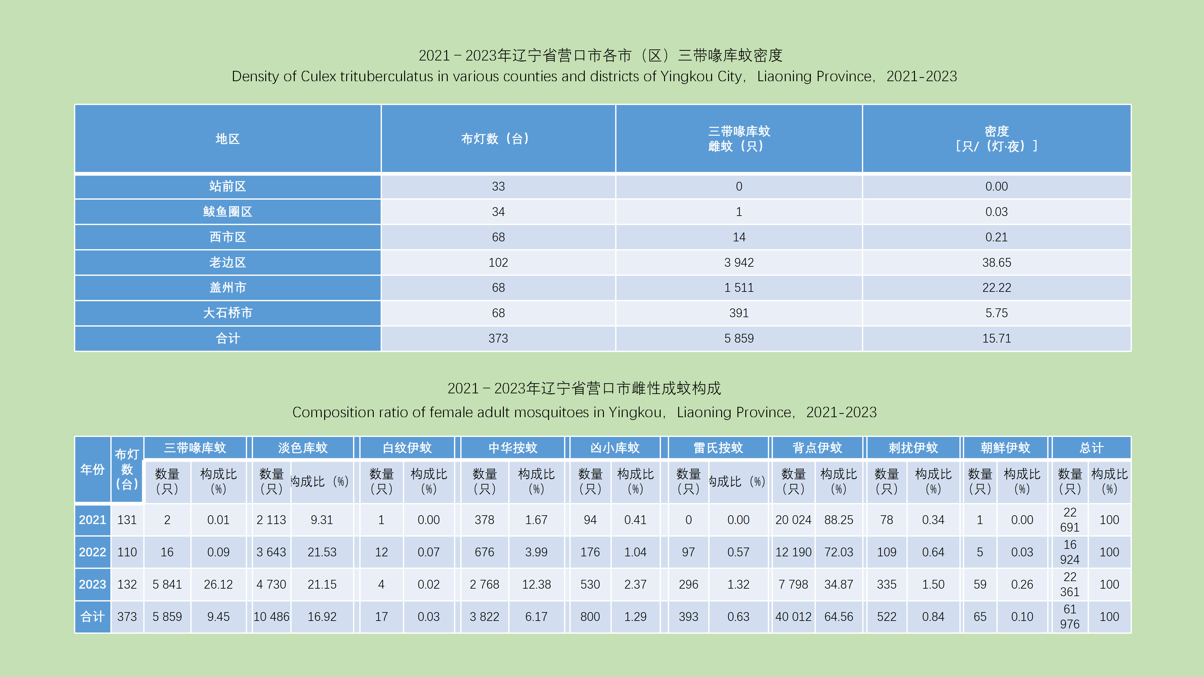 目的: 分析上海市成蚊生态学监测数据,了解上海市蚊虫种群结构与时空分布特征,为蚊虫和蚊媒传染病风险预警提供依据。方法: 2017-2023年采用CO2诱蚊灯法监测蚊虫,共收集上海市16个区不同监测生境的监测数据,利用Python 3.11软件对不同年度、不同生境蚊种构成进行χ2检验,对不同年度、不同蚊种、不同生境蚊密度月度变化进行多配对样本的Friedman检验分析,用ArcGIS Pro 3.0软件进行绘图。结果: 2017-2023年上海市蚊密度为4.86只/(灯·夜),淡色库蚊、白纹伊蚊、三带喙库蚊、骚扰阿蚊、中华按蚊分别占捕获总数的76.99%、14.40%、6.13%、1.91%和0.57%;蚊密度呈先降低再升高趋势,不同年度蚊种构成差异有统计学意义(χ2=6 300.543,P < 0.001)。学校、工地、牲畜棚蚊密度最高,分别为12.10、11.46和8.30只/(灯·夜),不同生境蚊种构成差异有统计学意义(χ2=26 258.065,P < 0.001)。5月下旬至9月上旬为蚊虫高峰期,在季节消长上,不同年度、蚊种、生境蚊密度季节消长差异有统计学意义(均P < 0.001)。各区平均蚊密度差异较大,蚊密度最高的为徐汇区,最低的为长宁区。不同蚊种在不同区分布差异较大,淡色库蚊构成比在杨浦区(89.29%)最高,三带喙库蚊构成比在金山区(33.06%)最高,骚扰阿蚊构成比在崇明区(7.17%)最高,中华按蚊构成比在嘉定区(1.57%)最高,白纹伊蚊构成比在黄浦区(57.16%)最高。结论: 上海市各区蚊密度和蚊种构成差异较大,应因地制宜,制定相应的监测和防控策略。5月下旬至9月上旬为蚊虫高峰期,应加强防蚊和灭蚊。