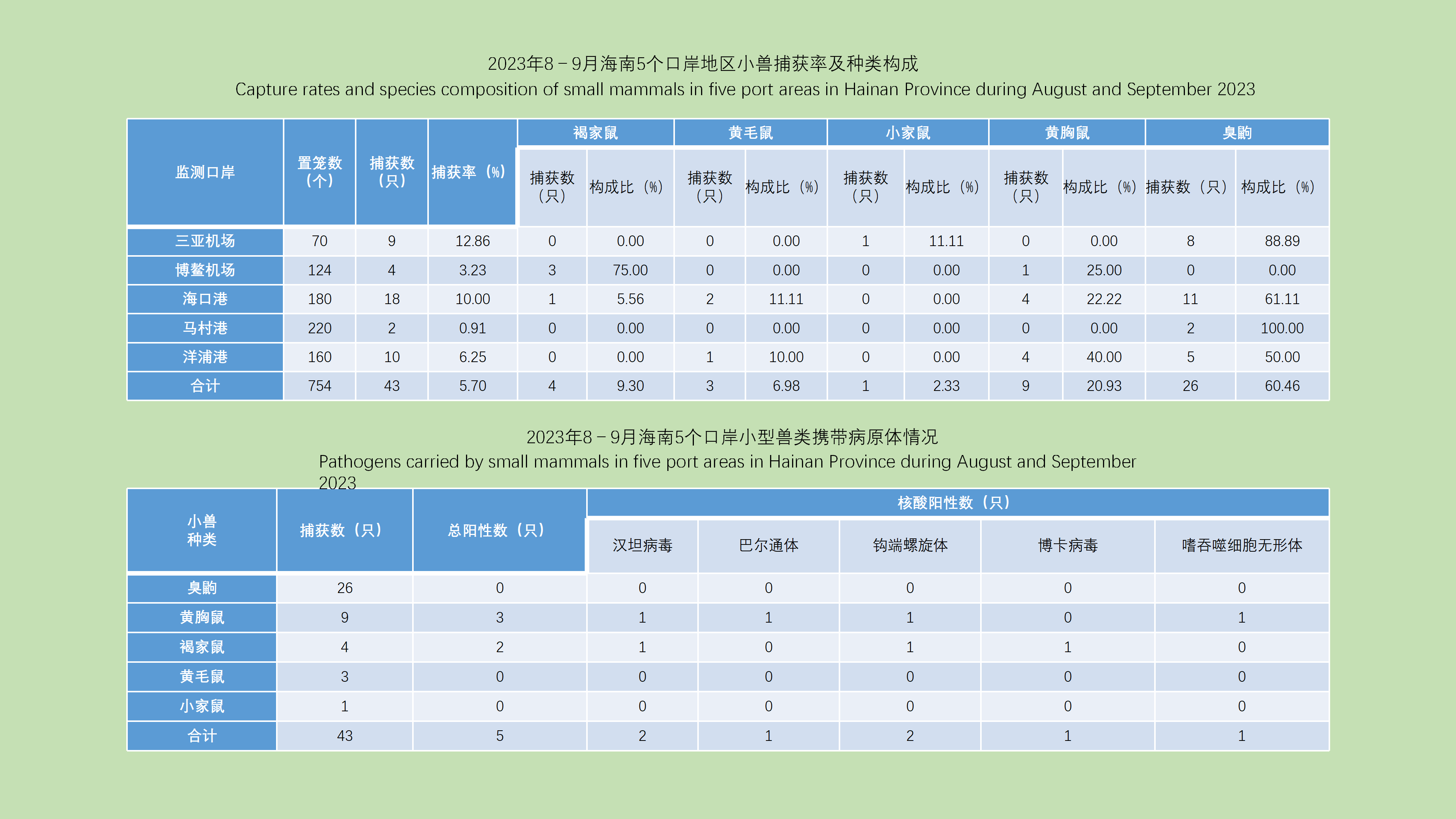 目的: 了解江苏省宿迁市鼠类种类构成及病原体携带情况,为当地鼠类防制及鼠传疾病防控提供科学依据。方法: 鼠类生态学监测采用夹夜法,选择宿迁市5个县(区)为监测点。鼠传病原监测在鼠类生态学监测捕获鼠类基础上进行补充采集,应用TaqMan探针法的荧光定量聚合酶链式反应(qPCR)/荧光定量反转录聚合酶链式反应(RT-qPCR)方法,检测鼠类脏器中致病性钩端螺旋体、斑疹伤寒立克次体、嗜吞噬细胞无形体、巴尔通体、恙虫病东方体、土拉弗朗西斯菌、汉坦病毒和大别班达病毒等8种病原体核酸。采用Excel 2019和R 4.4软件进行数据整理和分析,采用χ2检验和Fisher确切概率法进行构成比和率的比较。结果: 2022—2023年宿迁市鼠类生态学监测平均鼠密度为0.21%(47/22 251),其中褐家鼠占61.70%(29/47),黄胸鼠和小家鼠均占19.15%(9/47);不同生境鼠密度差异有统计学意义(χ2=26.306,P<0.001)。鼠传病原监测捕获鼠类及鼩鼱类共435只,病原体核酸检测阳性34只,阳性率7.82%,其中致病性钩端螺旋体核酸阳性29只,阳性率6.67%;巴尔通体核酸阳性16只,阳性率3.68%;汉坦病毒核酸阳性3只,阳性率0.69%,不同病原体核酸阳性检出率差异有统计学意义(χ2=24.244,P<0.001)。13只黑线姬鼠合并感染致病性钩端螺旋体、巴尔通体,1只褐家鼠合并感染致病性钩端螺旋体、汉坦病毒。其余病原体未检出。结论: 宿迁市鼠密度处于较低水平,褐家鼠是优势种。检出致病性钩端螺旋体、巴尔通体、汉坦病毒等3种病原体核酸阳性,存在鼠类合并感染2种病原体现象。需采取综合防治措施降低鼠密度,加强居民防控意识,避免与鼠类直接或间接接触,防止鼠源疾病的发生。