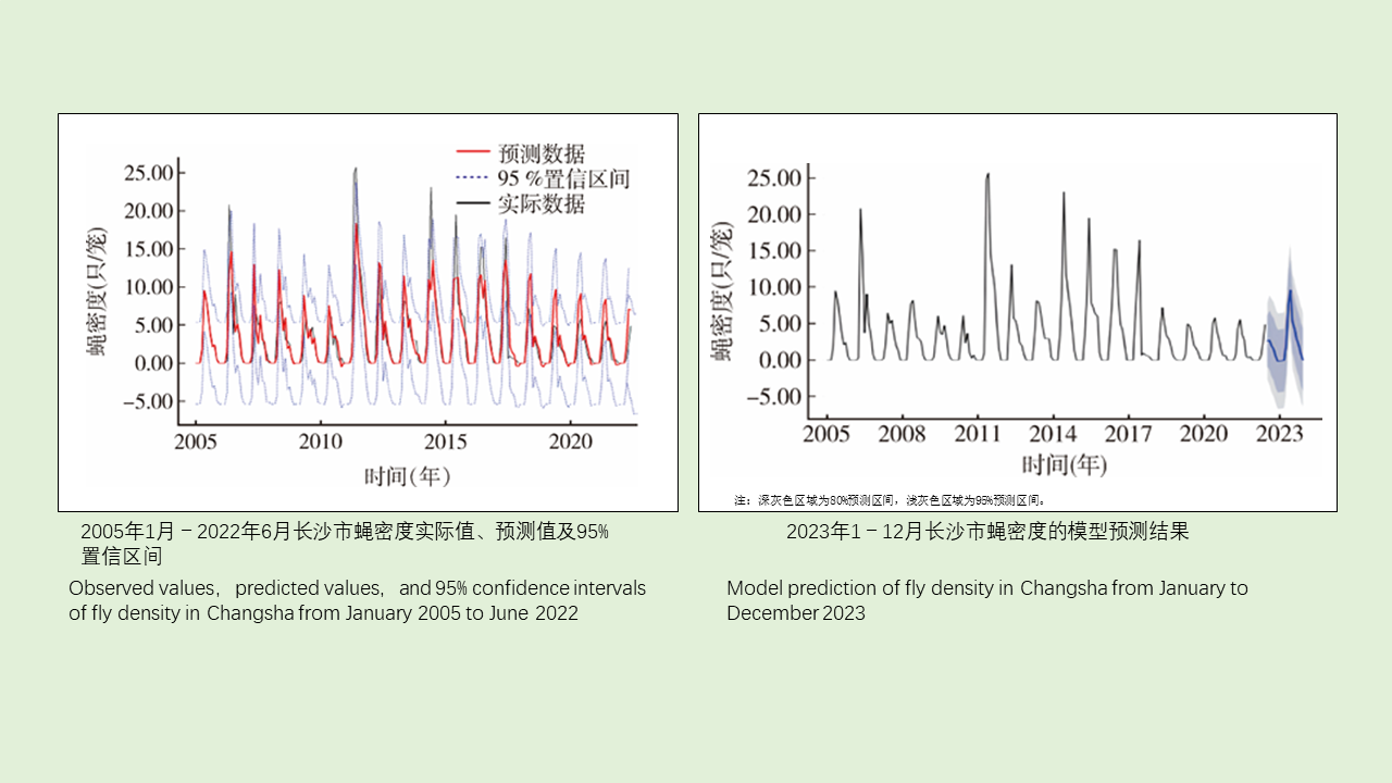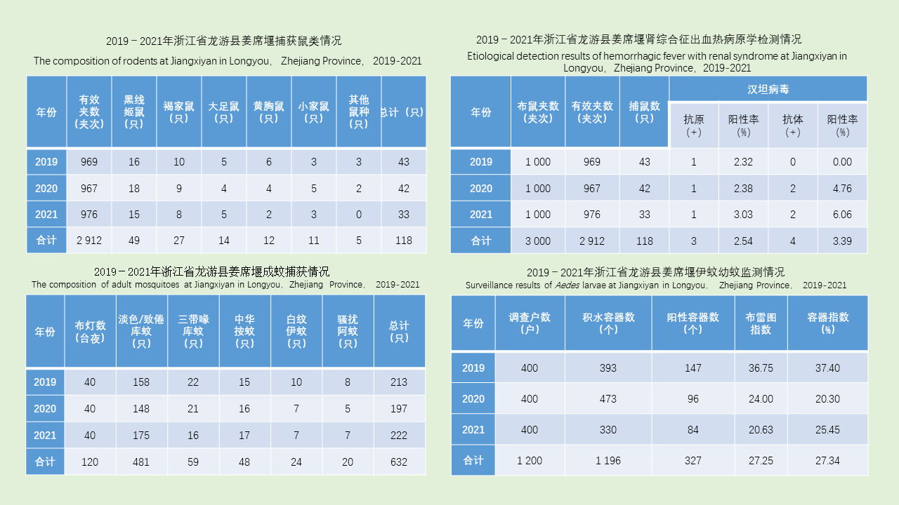 目的 了解杭州市2017-2021年蝇种构成、种群密度和季节消长趋势,探讨气象因素对蝇类密度的影响,为蝇类防制提供科学依据。方法 2017-2021年4-11月在杭州市选择居民区、餐饮外环境、绿化带、农贸市场4类生境,采用笼诱法进行蝇密度监测,对获得的数据使用Excel 2019和SPSS 20.0软件进行统计分析。对不同年份、生境间数据差异进行χ2检验和单因素方差分析,对蝇类密度和气象因素进行相关和回归分析。结果 2017-2021年杭州市共布放诱蝇笼4 967个,捕获蝇10 267只,蝇类总密度为2.07只/笼;以麻蝇科蝇种、家蝇、丝光绿蝇和大头金蝇为优势蝇种,占捕获总数的74.00%,其中麻蝇科蝇种密度最高,为0.32只/笼。不同生境中,农贸市场蝇类密度最高,为2.79只/笼,餐饮外环境最低,为1.44只/笼,不同生境间蝇密度差异有统计学意义(F=8.493,P=0.001)。杭州市不同地区中,余杭区蝇类密度最高,建德市蝇类密度最低,各地区蝇类密度差异无统计学意义(F=1.433,P=0.140)。蝇类密度总体的季节消长呈“双峰”,高峰分别出现在6和8月,不同年份蝇类密度季节消长差异无统计学意义(F=0.865,P=0.495)。杭州市蝇类密度与平均气温、平均最高气温、最高气温极值、平均气温≥18 ℃的天数、平均露点温度、降水量、最大单日降水量、平均最低气温和最低气温极值呈现正线性相关;多元逐步回归分析显示,平均最高气温可进入回归方程y=-1.707+0.430x(F=79.701,P<0.001)。结论 杭州市总体上以麻蝇科蝇种为优势蝇种,蝇密度以农贸市场最高,活动高峰期以夏季为主,蝇密度受多种气象因素影响,建议蝇类防制时在其活动高峰期前及早采取综合措施,以控制蝇密度处于不足为害的水平。