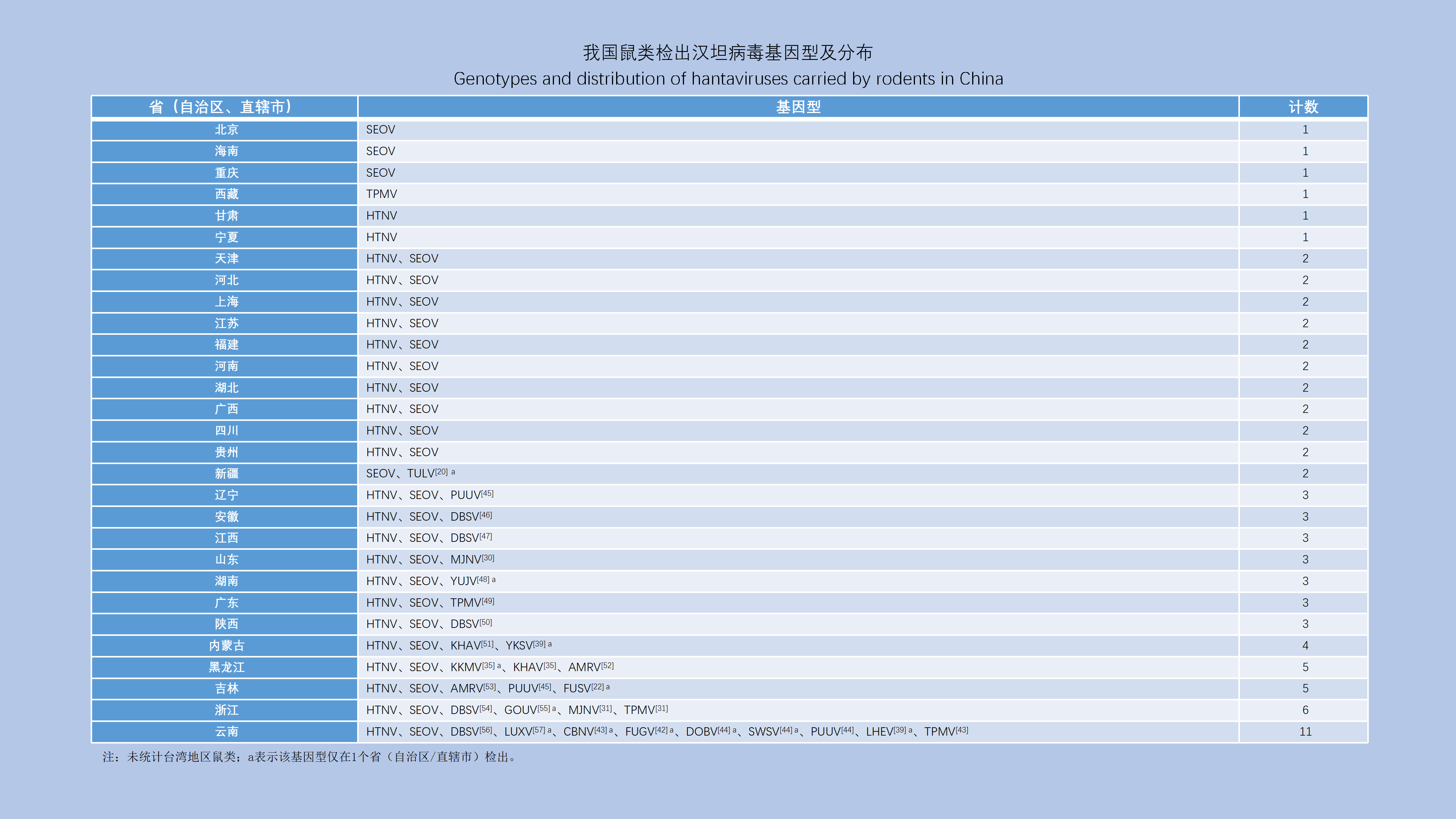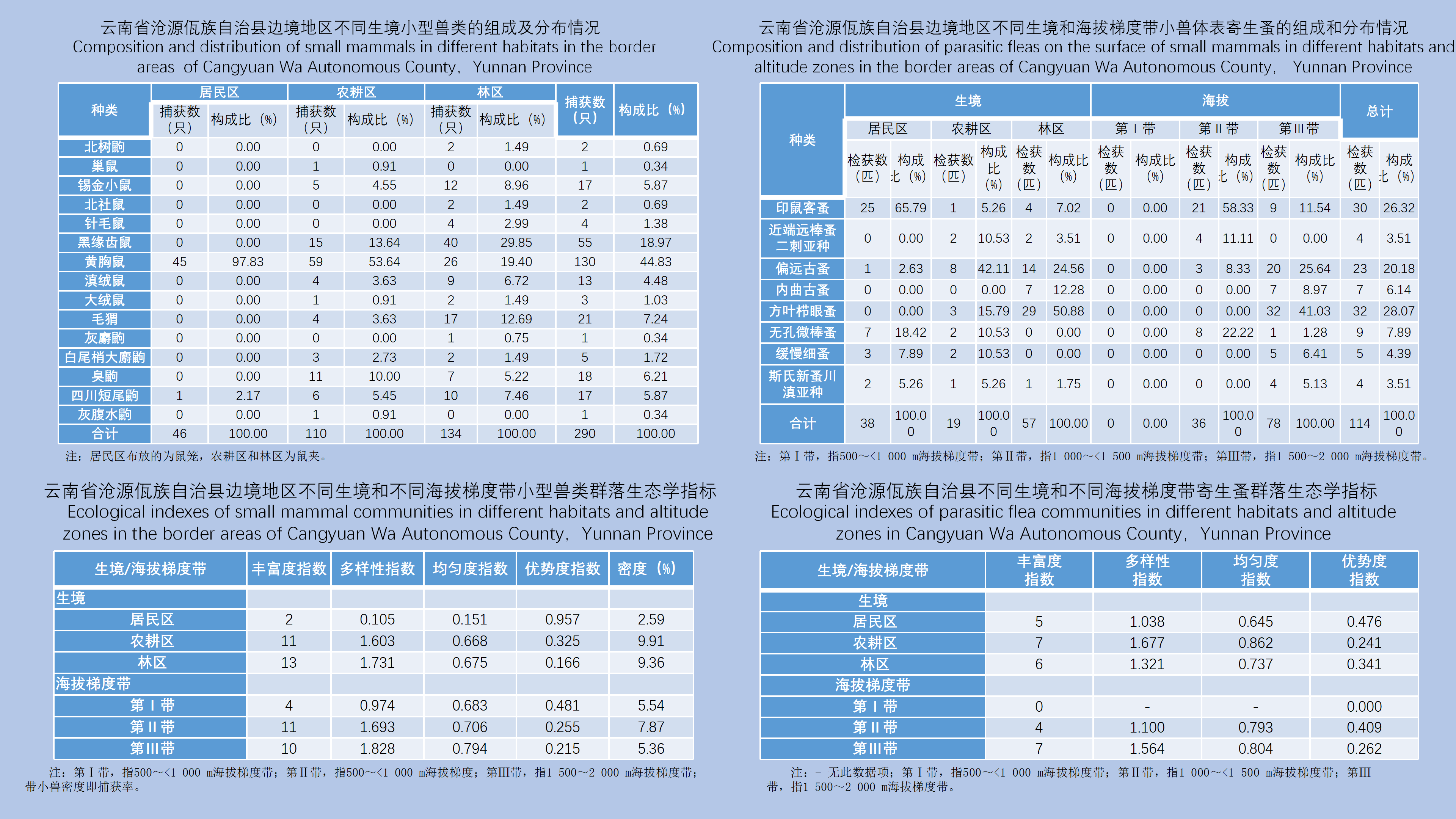 目的 了解新疆维吾尔自治区(新疆)北疆地区蜱及啮齿动物携带病毒的种类及阳性率,为相关疾病的防控提供参考。方法 2013-2024年在新疆北疆地区11个县(市、区),采用布旗法和人工诱捕法采集游离蜱,并用中号板夹采用5 m夹线法捕获夜行鼠,用弓形夹捕获大沙鼠和长尾黄鼠。蜱类和啮齿动物脑、肺、肝、脾、肾、肠脏器样本提取RNA后制备成cDNA,采用454高通量、Illumina HiSeq 2500和Illumina NovaSeq 3000测序,采用Trinity 2.5组装拼接后通过基于局部比对算法的搜索工具(BLAST)进行比对和注释。根据序列信息,设计重点病毒的特异性引物,采用反转录PCR(RT-PCR)方法进行病毒核酸检测。结果 蜱样本高通量测序42组4 076只,共建立23个测序文库,发现病毒12科24种及10种未分类病毒,其中,草原革蜱、亚洲璃眼蜱及盾糙璃眼蜱分别携带33、24及10种病毒。RT-PCR检测蜱样本596组56 042只,从草原革蜱、亚洲璃眼蜱及盾糙璃眼蜱中分别检出14、12、10种病毒。蜱样本中发现的重要人畜共患病原体有4科5种,包括克里米亚-刚果出血热病毒(CCHFV)、古尔图病毒(GTV)、多里病毒(DHOV)、博乐蜱病毒1(BLTV 1)和塔城蜱病毒5(TCTV 5);其中,CCHFV在草原革蜱、亚洲璃眼蜱及盾糙璃眼蜱中检出组阳性率分别为1.46%、5.00%和6.25%,GTV为11.04%、15.00%和18.75%,TAMV为3.31%、9.46%和0.00%,BLTV 1为11.16%、20.27%和66.67%,TCTV 5为12.10%、23.00%和12.50%。啮齿动物样本高通量测序25只125份组织样本,共建立113个测序文库,发现病毒23科55种及4种未分类病毒。其中,子午沙鼠、灰仓鼠、小家鼠、三趾跳鼠及大沙鼠分别携带45、13、7、6、5种病毒;RT-PCR检测啮齿动物样本153组1 092只,从大沙鼠、子午沙鼠和长尾黄鼠中均检出CCHFV和GTV阳性,CCHFV组阳性率分别为6.50%、9.09%和9.09%,GTV组阳性率分别为16.00%、18.18%和20.00%,三趾跳鼠CCHFV组阳性率为25.00%。发现的重要人兽共患病毒有TAMV、BLTV 1、鼠肝炎病毒(RHV)和脑心肌炎病毒(EMCV)等。结论 新疆北疆地区蜱及啮齿动物携带病毒丰富,且存在CCHFV、GTV、TAMV、TCTV 5、BLTV 1等多种可感染人和动物的病毒。