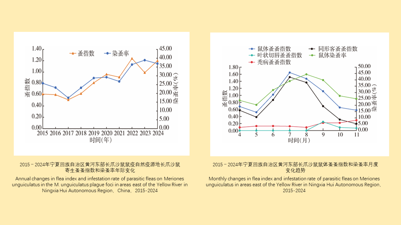 目的: 分析宁夏回族自治区(宁夏)黄河东部长爪沙鼠鼠疫自然疫源地2015-2024年长爪沙鼠鼠体寄生蚤种类构成和变化规律,为宁夏动物间鼠疫早期预警提供数据支撑。方法: 用Excel 2019汇总2015-2024年长爪沙鼠鼠体蚤数量、种类,分析鼠体蚤群落结构特点;分析长爪沙鼠鼠体蚤的蚤指数、染蚤率月度分布规律;采用Mann-Whitney U秩和检验,检验动物鼠疫流行年份与非流行年份的长爪沙鼠染蚤率、蚤指数差异;采用Spearman秩相关分析,分析长爪沙鼠染蚤率与蚤指数的相关性;应用单因素二元logistic回归,分析长爪沙鼠染蚤率和蚤指数对动物鼠疫流行的影响。结果: 2015-2024年共获蚤13 028匹,隶属于5科9属13种,鼠体蚤优势种为同形客蚤(9 795/13 028,75.18%)和秃病蚤(2 495/13 028,19.15%),全年均有分布,常见种为叶状切唇蚤(486/13 028,3.73%),只在9-11月有分布;2015-2024年鼠体寄生蚤染蚤率和蚤指数年际变化趋势整体均呈现上升趋势;动物鼠疫流行年份与非流行年份的染蚤率差异有统计学意义(Z=-2.526,P=0.012),且流行年份染蚤率高于非流行年份,动物鼠疫流行与非流行年份的蚤指数差异无统计学意义(Z=-1.323,P=0.186);Spearman秩相关分析显示染蚤率与蚤指数呈正相关(ρ=0.901,P < 0.001);二元logistic回归分析显示长爪沙鼠鼠体染蚤率与动物间鼠疫流行的关联有统计学意义(OR=1.17,95%置信区间:1.04~1.32,P=0.008),而长爪沙鼠鼠体蚤指数与动物间鼠疫流行的关联无统计学意义(OR=0.09,95%置信区间:0.01~1.08,P=0.057)。结论: 宁夏黄河东部长爪沙鼠鼠疫自然疫源地长爪沙鼠鼠体蚤群落结构及其季节动态与动物鼠疫流行密切相关,染蚤率可作为区域性鼠疫流行风险预警的关键指标。