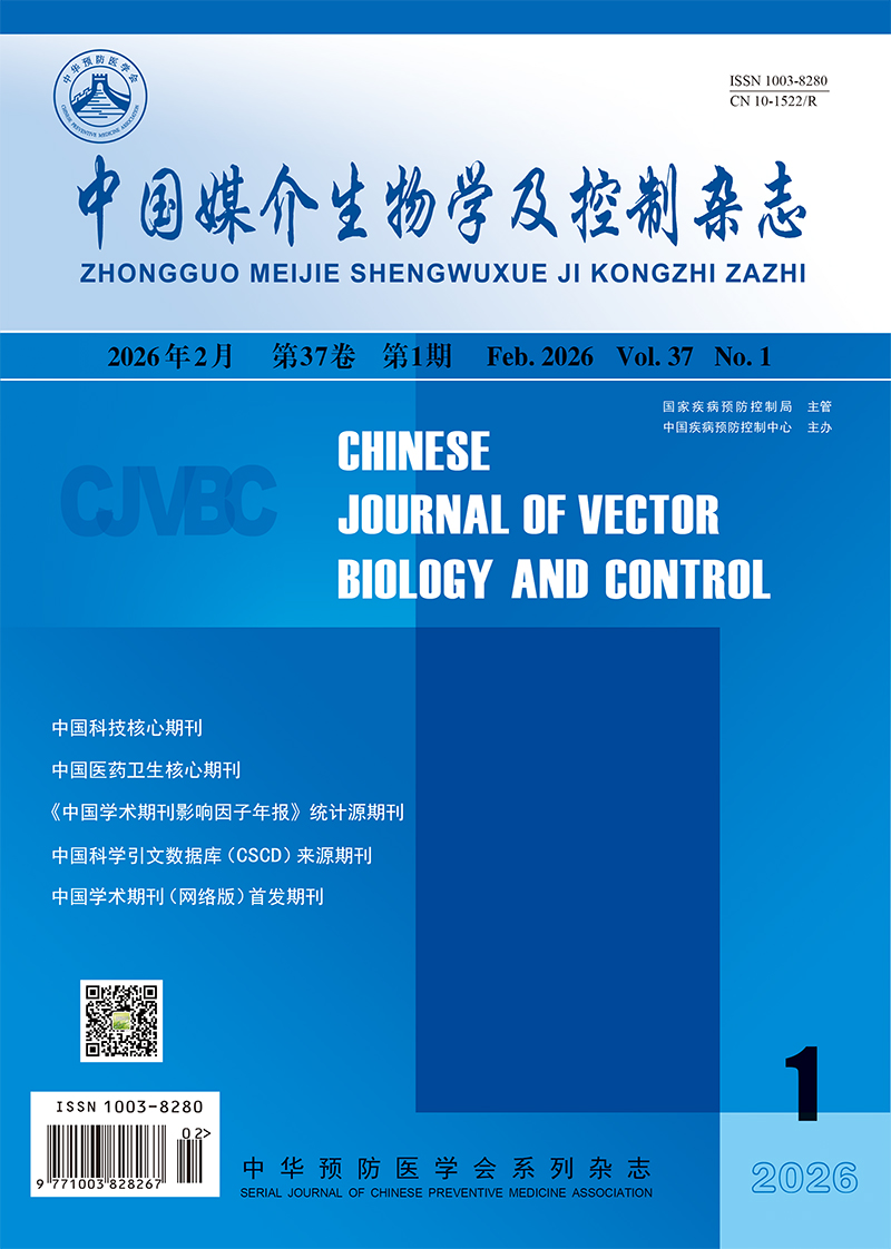 目的: 分析2017-2024年长沙市城郊农村蚊虫消长规律,为长沙市城郊农村蚊虫的综合防制提供科学依据。方法: 每年4-11月,使用诱蚊灯法在长沙市城郊农村的民房、猪圈开展蚊虫监测,对其种类构成、密度年际消长及季节消长进行分析。采取χ2检验对蚊虫种类构成比进行比较,采取Wilcoxon秩和检验对不同生境的蚊密度进行比较,采取Kruskal-Wallis H检验对不同年份及不同月份的蚊密度进行比较。结果: 2017-2024年长沙市城郊农村优势蚊种为淡色/致倦库蚊、三带喙库蚊及骚扰阿蚊,构成比分别为51.38%、33.26%、11.50%,不同年份蚊虫构成比差异有统计学意义(χ2=14 080.873,P < 0.001)。2017-2024年平均蚊密度为70.47只/(灯·夜),2017-2018年密度升高,2018-2020年迅速下降,2020-2024年缓慢上升,2018年蚊密度最高,为138.61只/(灯·夜),2020年最低,为44.13只/(灯·夜),不同年份间蚊密度差异无统计学意义(H=6.098,P=0.528)。猪圈平均蚊密度[95.44只/(灯·夜)]高于民房[45.50只/(灯·夜)](Z=-3.948,P < 0.001)。全年蚊虫季节消长呈双峰分布,6月及9月为密度高峰。不同月份间蚊密度差异有统计学意义(H=73.928,P < 0.001),蚊虫活动高峰主要集中在每年的5-7月及9月,密度分别为117.22、195.08、93.95和62.18只/(灯·夜)。结论: 2017-2024年长沙市城郊农村蚊密度呈先升高、后迅速下降、再缓慢上升的趋势,蚊虫活动高峰主要集中在每年的5-7月及9月。应结合城郊农村的生态环境特点及蚊虫活动高峰,制定相应的蚊虫综合防制方案。