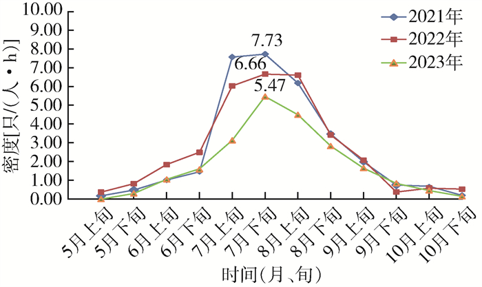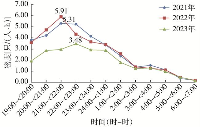 表3 2021-2023年湖北省6个监测点夜间人诱法不同时段捕获按蚊密度[只/(人·h)]Tab. 3 Density of Anopheles mosquitoes captured with the human trap method at different time periods at night at six surveillance sites in Hubei Province, 2021-2023 (mosquitoes/person·h) |