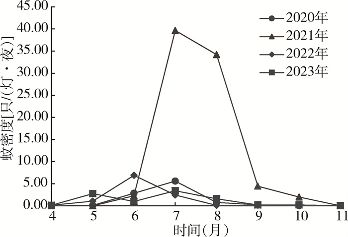 表1 2020-2023年重庆市沙坪坝区蚊种构成Tab. 1 Mosquito species composition in Shapingba District, Chongqing, China, 2020-2023 |