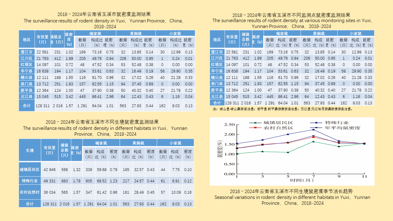 目的 掌握河北省蝇类种类构成、密度、生境分布及季节消长等特征,为河北省蝇类防制提供科学依据。方法 2011-2023年4-11月,在河北省17个市、县蝇类监测质控点选择农贸市场、餐饮外环境、绿化带和居民区4类生境,采用笼诱法糖醋诱饵进行蝇密度监测,使用WPS Excel 11.1.0.11045 和R 4.2.2软件处理数据,并采用χ2检验、t检验、方差分析、Kruskal-Wallis H检验和Friedman检验分析蝇种构成,比较不同种类、不同年份、不同月份、不同生境和不同地区蝇密度差异及其季节消长变化规律。结果 2011-2023年河北省共布放诱蝇笼9 349个,捕蝇42 647只,平均蝇密度为4.56只/笼,优势种群为家蝇、厩腐蝇、麻蝇科蝇类和丝光绿蝇,分别占捕获总数的52.91%、13.46%、9.26%和5.54%。河北省2019-2023年蝇类总密度呈下降趋势。蝇类总密度季节消长呈单峰型,峰值在8月,密度达7.25只/笼。不同生境蝇密度季节消长亦呈单峰型,7-8月达到峰值。4种生境中,农贸市场蝇密度最高,达6.13只/笼,其次是居民区、绿化带和餐饮外环境,不同生境蝇密度差异有统计学意义(Q=26.012,P<0.001)。2011-2020年,农贸市场蝇密度最高,2021-2023年绿化带蝇密度最高,不同生境蝇密度年度消长变化差异有统计学意义(F=15.541,P<0.001)。河北省南部地区平均蝇密度为5.88只/笼,北部地区为3.98只/笼,南、北部地区蝇密度差异有统计学意义(t=-3.055,P=0.009)。结论 河北省蝇类的主要防制对象是家蝇、厩腐蝇、麻蝇科蝇类和丝光绿蝇,农贸市场是重点防制场所,近年绿化带蝇密度有所上升,蝇类活动高峰期在7-8月,各地区应结合当地蝇类活动规律,在蝇类发生高峰期前采取防制措施。
