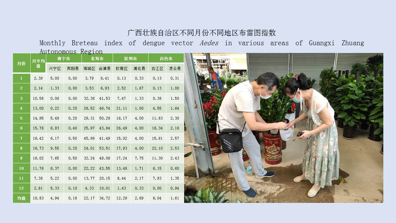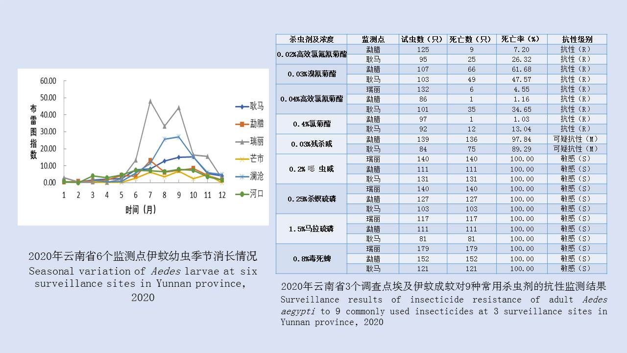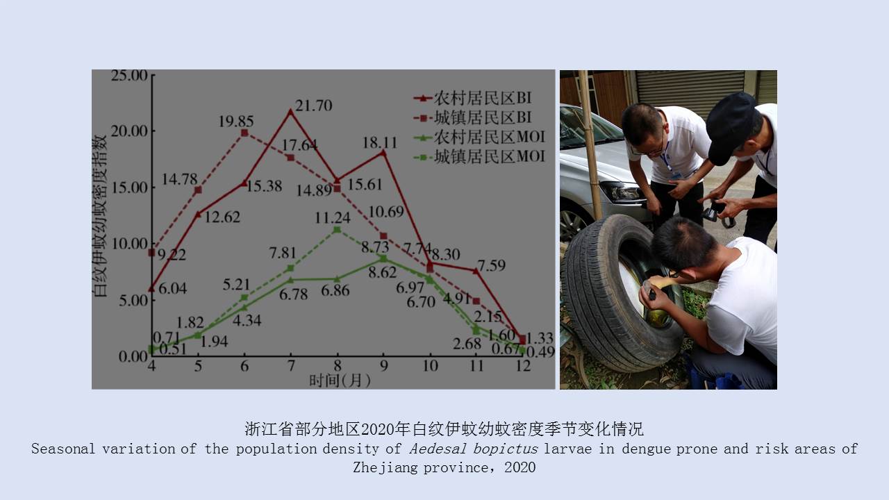 Objective To analyze the ecological surveillance results of Aedes vector in 12 provinces (autonomous regions or municipalities) in China in 2020-2021, and to provide a scientific basis for risk assessment, prediction, early warning, and control of Aedes-borne diseases. Methods The surveillance data of larval and adult Aedes densities at the special investigation sites of Aedes vector in 12 provinces (autonomous regions or municipalities) in China were collected and statistically analyzed by SPSS 18.0 software. Results In 2020-2021, the mean Breteau index (BI) was >10.00 in Hainan, Zhejiang, and Hunan provinces and >5.00 in Guangxi Zhuang Autonomous Region (Guangxi) and Yunnan, Henan, and Shandong provinces. The mean mosq-ovitrap index (MOI) was >5.00 in Guangxi, Guangdong, Hainan, and Shandong. The mean net trap index was ≥2.00 mosquitoes/net·hour in Henan, Hubei, and Shandong and >1.00 mosquito/net·hour in Guangxi, Guangdong, Hainan, Yunnan, Fujian, and Hunan. There were no statistical differences in BI, MOI, and net trap index between class I provinces (Guangdong, Hainan, Guangxi, Fujian, Yunnan, and Zhejiang) and other classes of provinces (t=0.766, 1.030, and -0.745, all P>0.05). The mean BI in 2020-2021 was higher than that in 2017-2019 in Guangdong, Guangxi, Yunnan, and Shandong, but lower than that in the three years in other provinces. The Aedes vector was found to be active throughout the year at the investigation sites in Guangdong, Hainan, Guangxi and Yunnan, from March to December in Fujian, Zhejiang, and Hubei, and from April to November in Chongqing municipality, Shandong and Henan, and from April to December in Jiangxi. The results of BI and MOI were inconsistent in Yunnan, Guangxi, and Hubei. During the study period, the BI of Aedes vector was >5.00 in areas where dengue outbreaks and local cases occurred, and >10.00 in Ruili city in Yunnan, Cenxi city of Wuzhou in Guangxi, and Sanjiao town of Zhongshan in Guangdong; the net trap index in Cenxi city of Guangxi was >2.00 mosquitoes/net·hour. Conclusion In 2020-2021, the mean Aedes density in the provinces with local cases of dengue fever in China was high, with spatio-temporal heterogeneity among different regions. It is suggested that in the local transmission areas of dengue in China, it is necessary to adjust moderately annual surveillance periods, to continuously strengthen Aedes vector surveillance and risk assessment, and to systematically sort out the ecological investigation results of Aedes vector, so as to provide a scientific basis for the revision and improvement of Aedes vector surveillance scheme and the outbreak control of Aedes-borne diseases in China.
